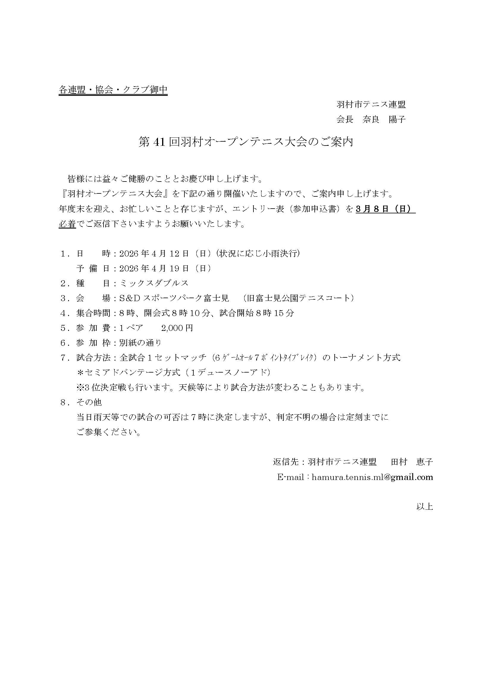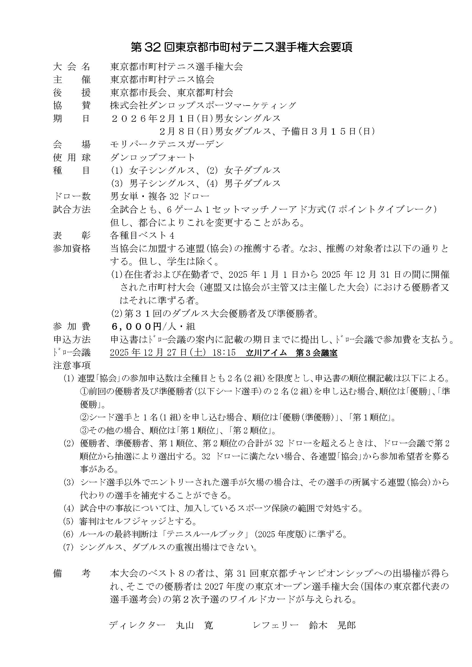 1.開催日:2026年2月1日(日)男女シングルス、2月8日(日)男女ダブルス  予備日3月15日(日)