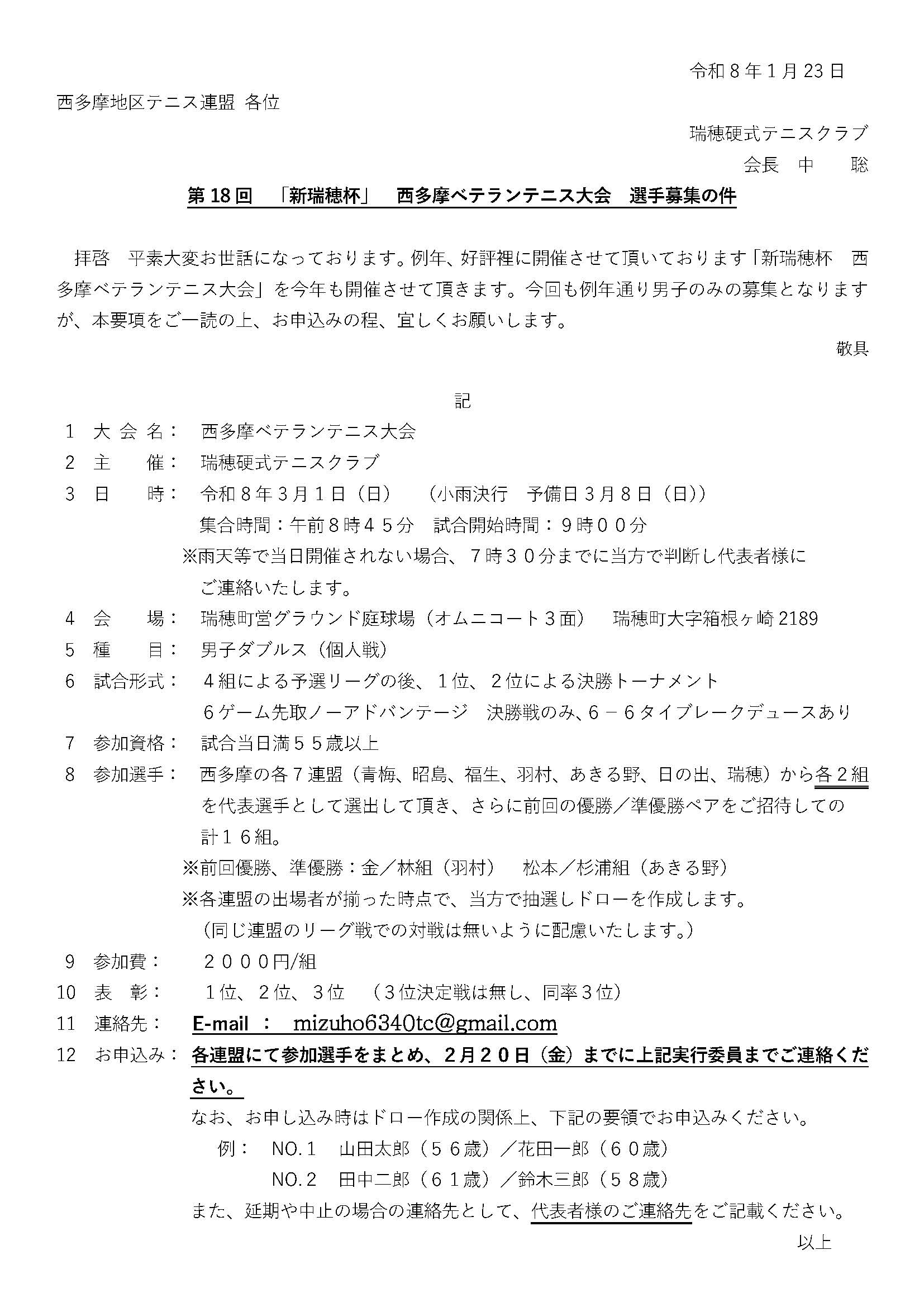 参加基準: 東京都在住、または西多摩地域行政圏テニス団体所属の60歳以上の男女